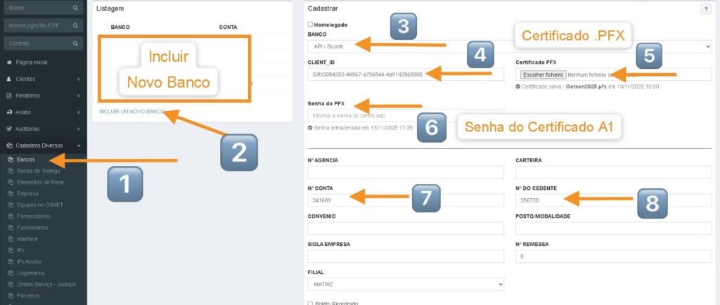 Atenção: Se houver conta Sicoob configurada por CNAB, não altere. Crie um novo banco do tipo API e mantenha ambos.