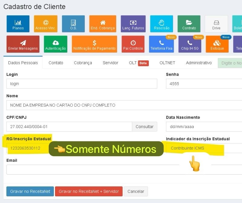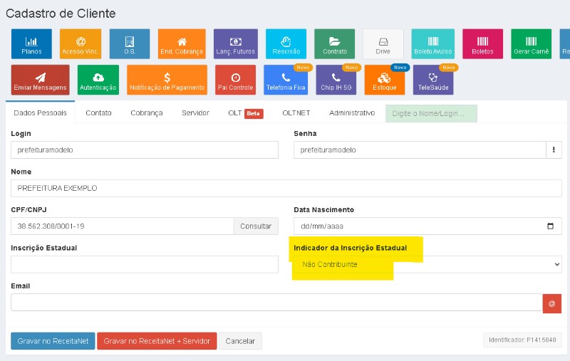 Na aba DADOS PESSOAIS do cliente, “Indicador da Inscrição Estadual” utilizado para quando a empresa não é contribuinte de ICMS.