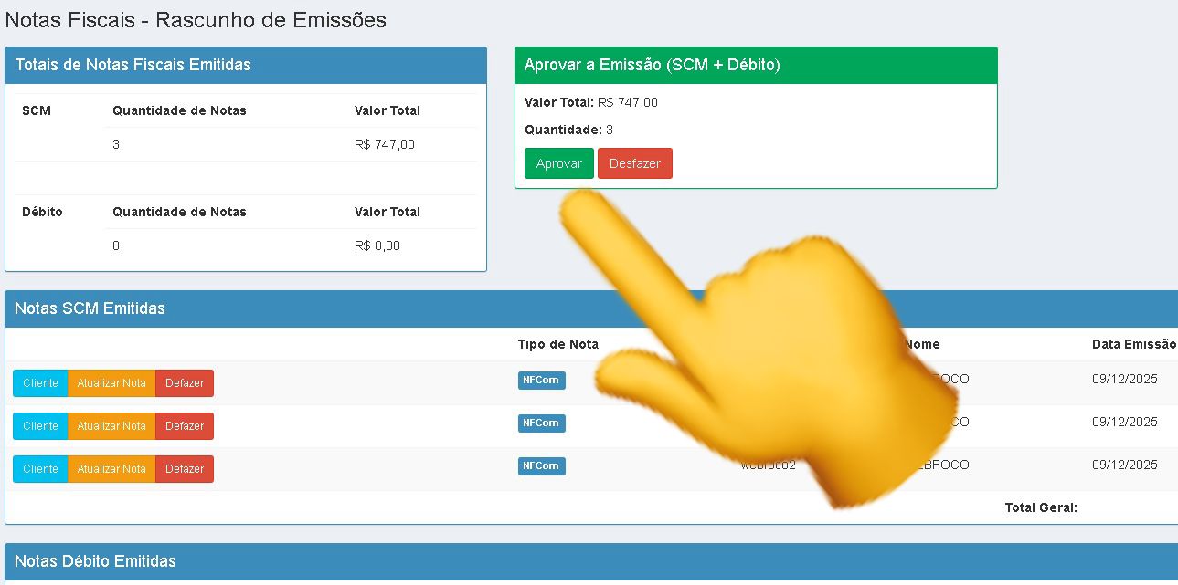 Após a emissão, a empresa tem de IMEDIATO clicar para APROVAR ou DESFAZER o arquivo de notas geradas.